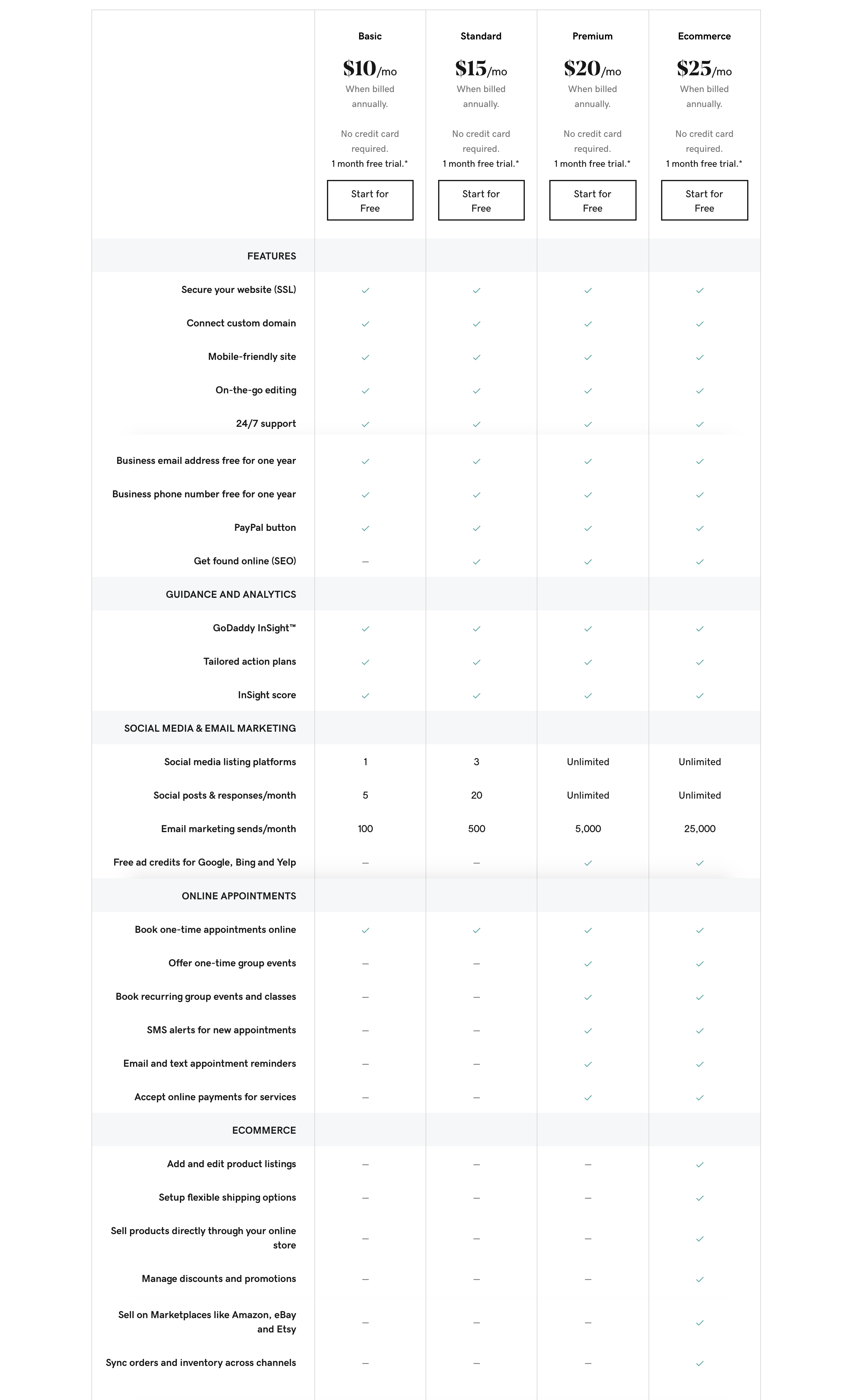 GoDaddy’s website builder prices start at $10/mo and go up to $20/mo. Then, with an Ecommerce addition which is required if you want to use the Online Store module which includes the integrations with Square, Stripe and PayPal, pricing goes up to $25/mo.